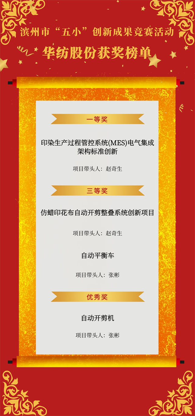近日,市總工會開展的濱州市“五小”創(chuàng)新成果競賽活動獲獎名單公布,公司申報(bào)的4項(xiàng)“五小”競賽創(chuàng)新成果喜獲殊榮,其中,《印染生產(chǎn)過程管控系統(tǒng)(MES)電氣集成架構(gòu)標(biāo)準(zhǔn)創(chuàng)新》獲一等獎,《仿蠟印花布自動開剪整疊系統(tǒng)創(chuàng)新項(xiàng)目》《自動平衡車》獲三等獎,《自動開剪機(jī)》獲優(yōu)秀獎。